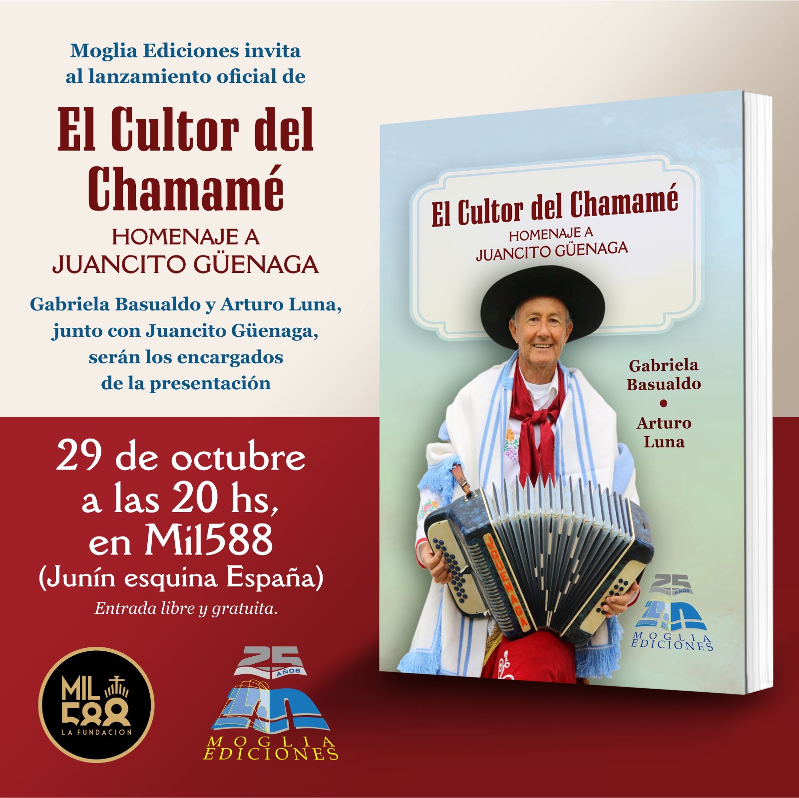 El pasado miércoles 29 de Octubre, en el salón de la Fundación 1588 de Corrientes, se presentó el libro "El Cultor del Chamamé - Homenaje a Juancito Güenaga" autoría de la Dra. María Gabriela Basualdo y Luis Arturo Luna, publicación de la editorial Moglia.