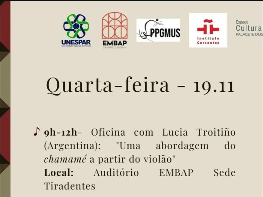 La Asesora Académica de la Fundación Memoria del Chamamé, Dra. Lucía Troitiño brindó una conferencia sobre chamamé en la Universidad Estadual de Paraná (Curitiba - Brasil), en el marco del "Simposio Académico sobre Violao" en su decimotercera edición.